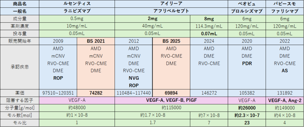 商品名、一般名以外で特徴的なところは太字にしています。薬価は特にルセンティス、アイリーアは複数あるので大まかに書いています。